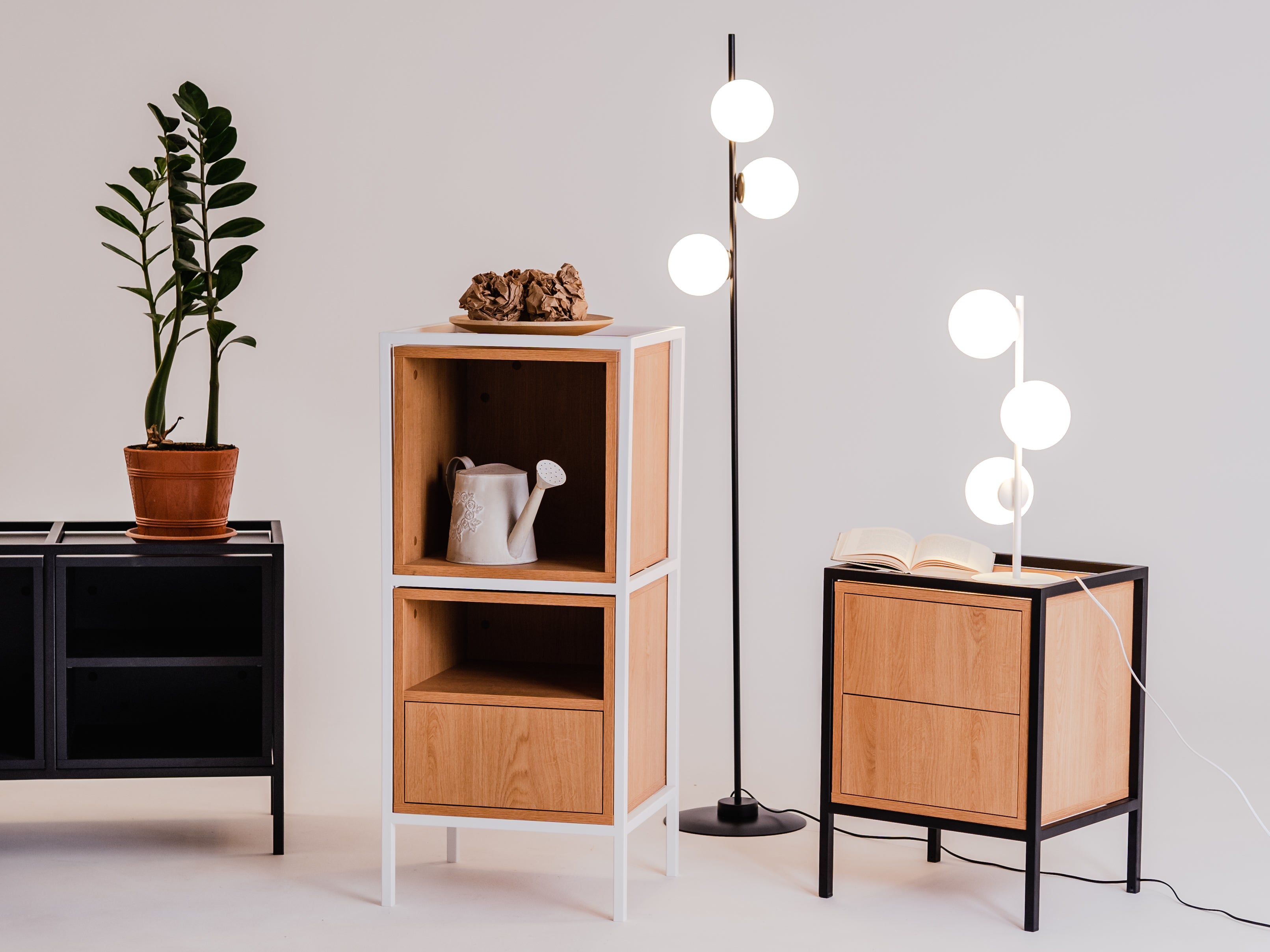 Os móveis SKAP são feitos de carvalho e painéis de madeira preta, uma única caixa tem um tamanho de 40x40x40 cm. A estrutura metálica é oferecida nas cores preta ou branca.