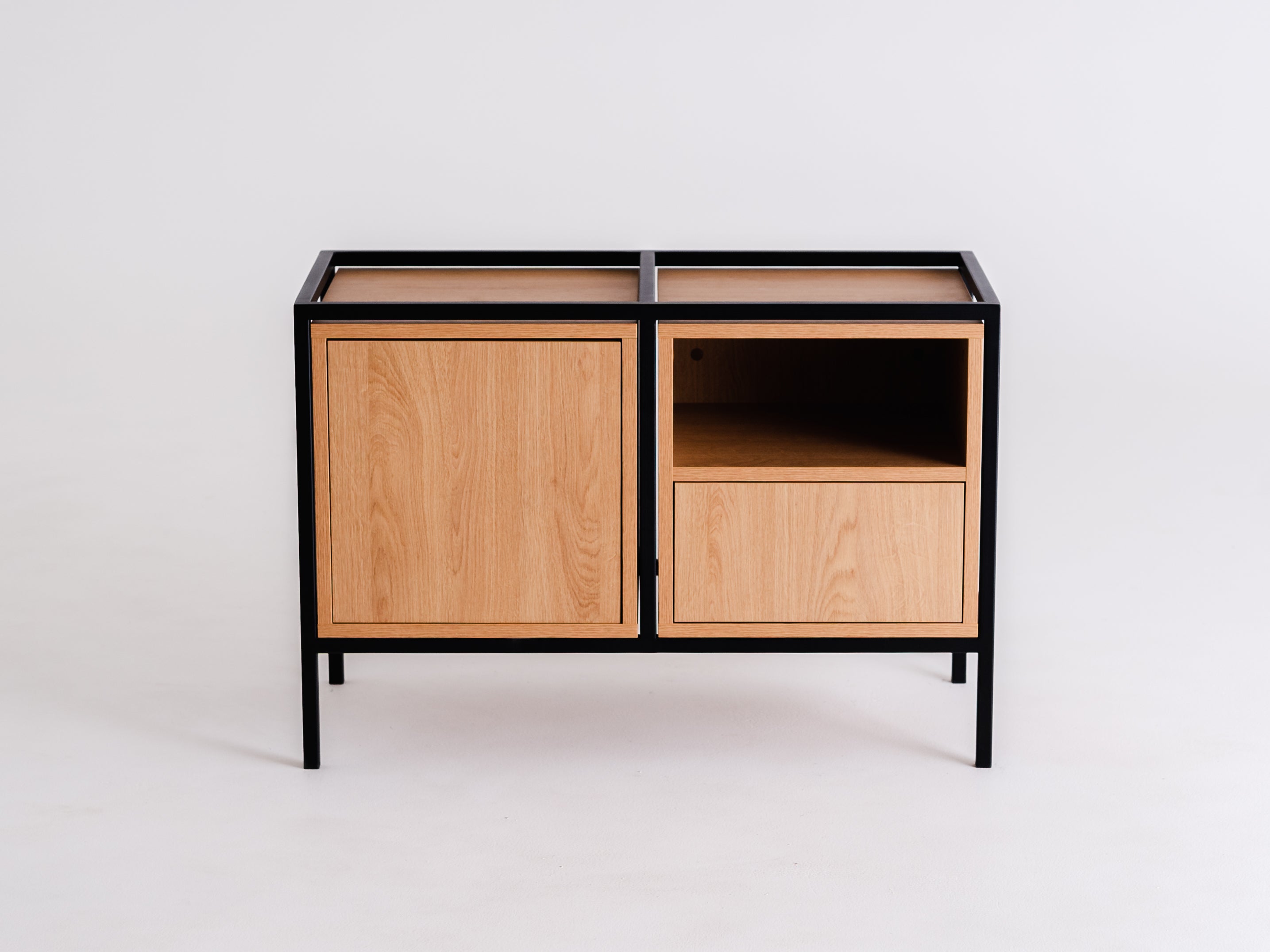 Os móveis SKAP são feitos de carvalho e painéis de madeira preta, uma única caixa tem um tamanho de 40x40x40 cm. A estrutura metálica é oferecida nas cores preta ou branca.